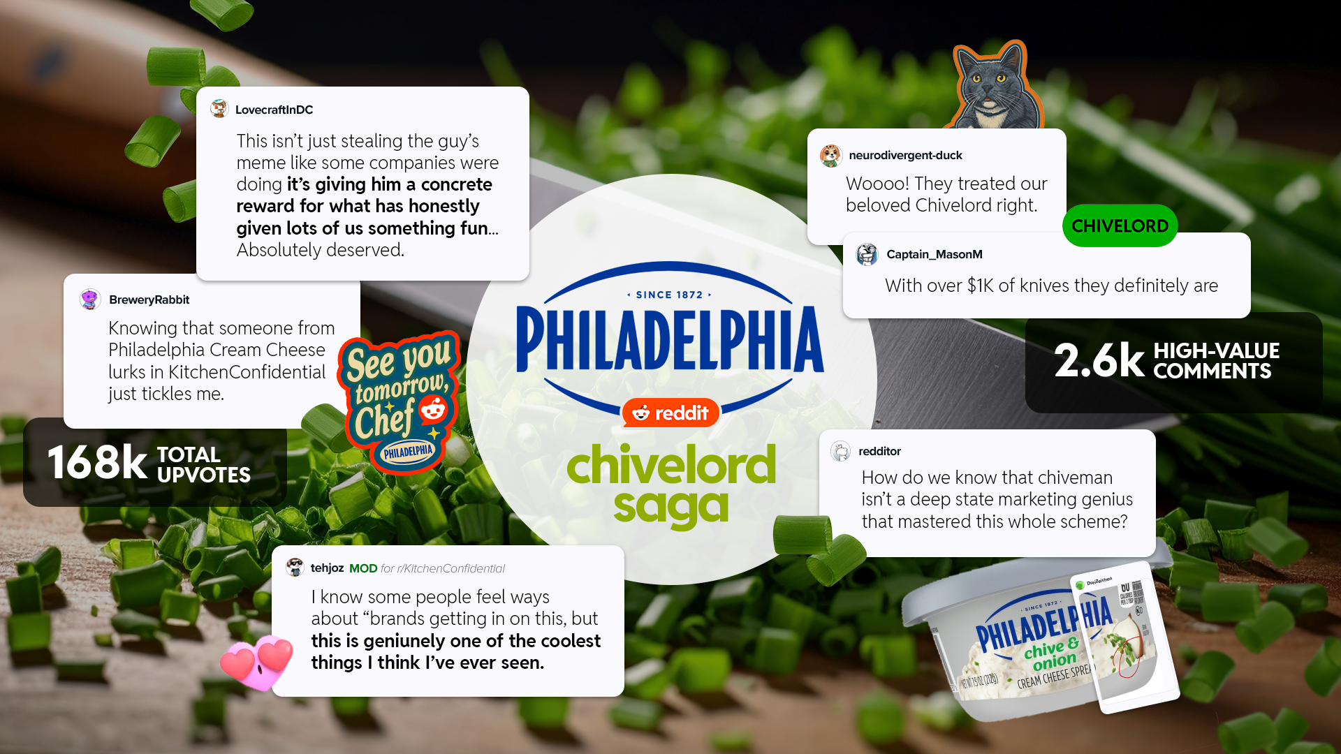 Across Reddit, users share niche passion projects every day. But in r/KitchenConfidential, a Reddit community of 2+ million food-service professionals and hobbyists, one small project turned into the community’s biggest drama—user u/F1exican posting daily photos of meticulously chopped chives until Reddit deemed them perfect. The community anticipated his daily ritual posts, filling each with chive analysis, encouragement, puns and even awarding him a nickname: “Chivelord.” Publications even took notice including the Today Show, The Washington Post, Food Network, The Takeout and more.