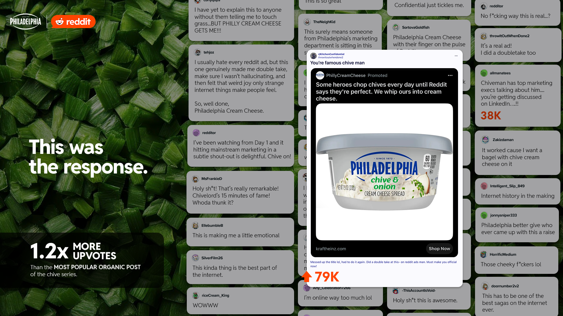 While Chivelord became a legend in this niche Reddit community, Philadelphia saw an opportunity to participate in the moment. Philadelphia subtly connected its chive cream cheese to the ongoing chive chopping saga, striking a careful balance between staying cool and casual, while showing they were truly listening.