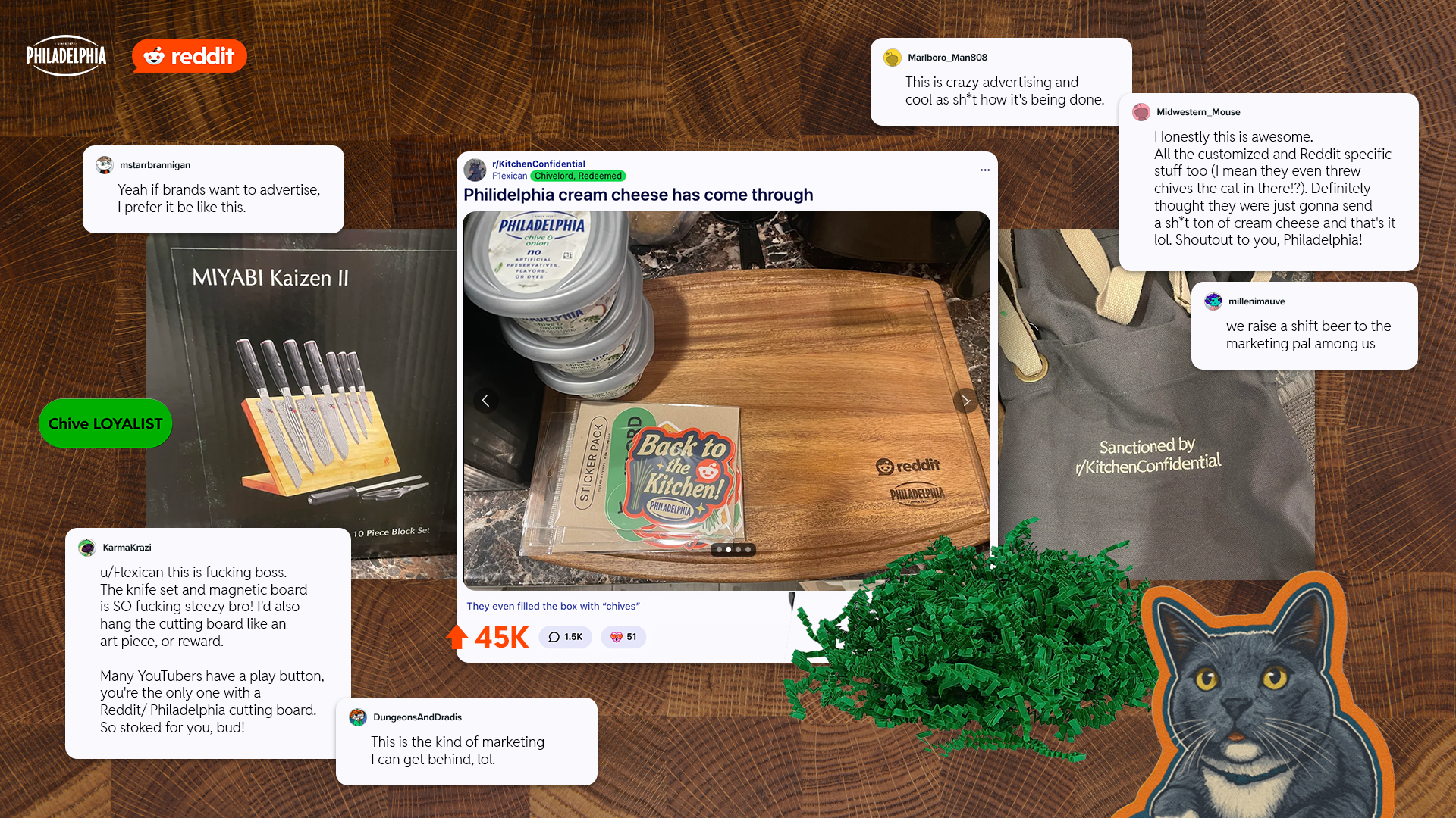 Some users commented that if brands reference a post, the redditor should be rewarded. What users didn’t know at the time is that Philadelphia had already privately reached out to Chivelord to send support for his chive-chopping journey. u/PhillyCreamCheese let the community know, as users eagerly rallied Chivelord to check his DMs. Philadelphia sent a care package including a professional knife set, personalized cutting board, apron, custom stickers, and Philadelphia Chive Cream Cheese. No strings attached, and no request to post or mention Philadelphia. It was completely up to him.