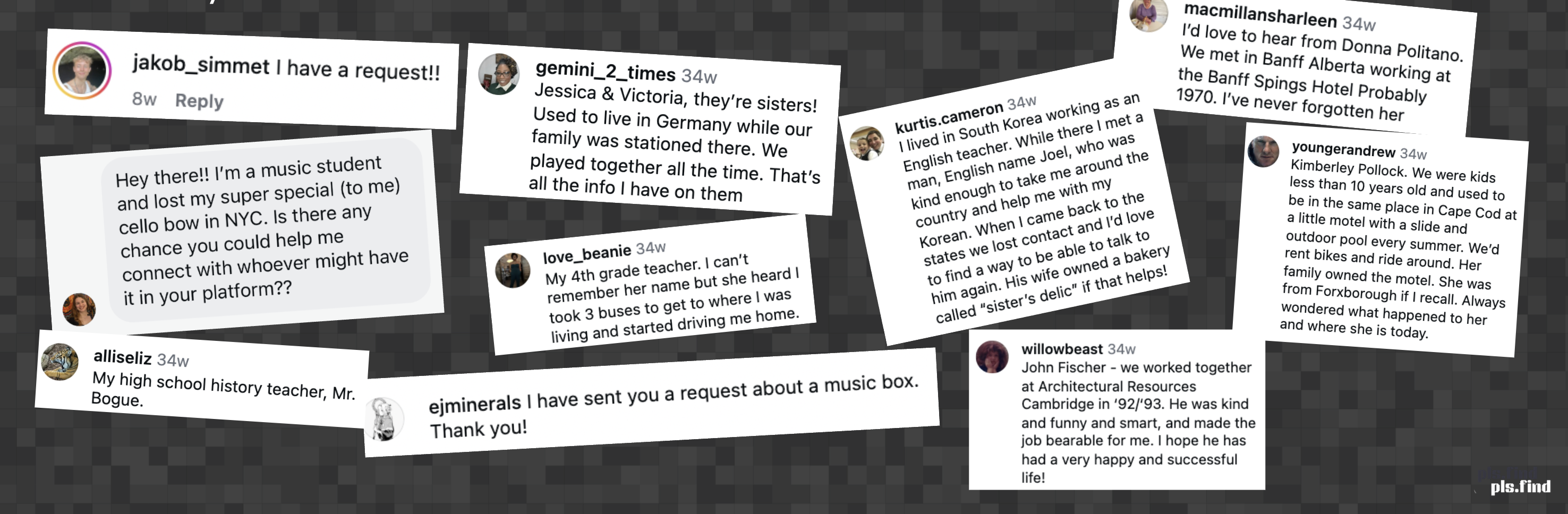 From there, we curated stories that aligned with the core goal of @pls.find: bringing people together over something beautiful. We indexed for the real possibility of a meaningful reunion, however unlikely, by leaning into a spark for collective effort. We followed up to comments via DM to understand the context of each story, then moved into interviews to assess what felt ethically and potentially solvable (even if a remote possibility).