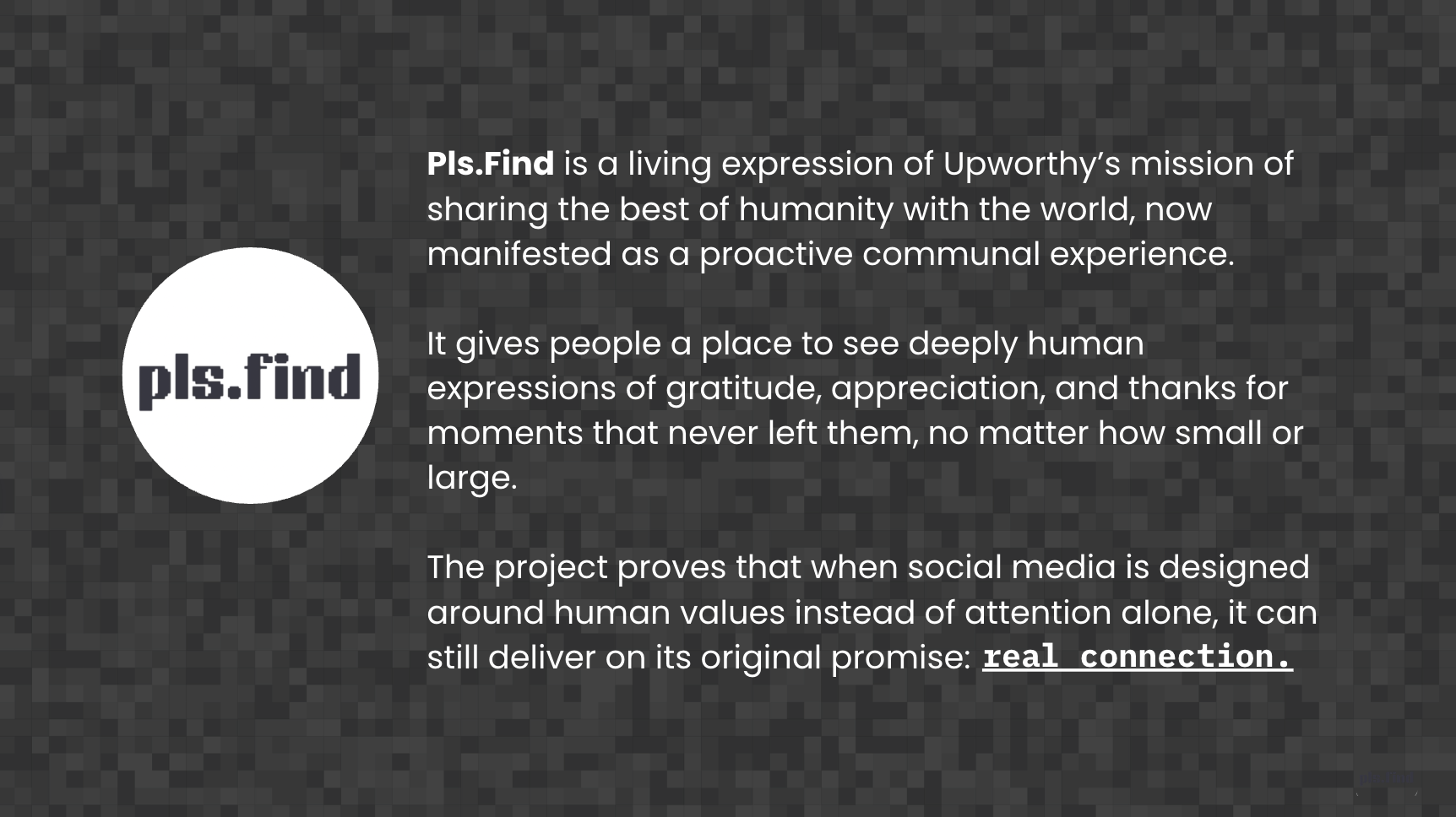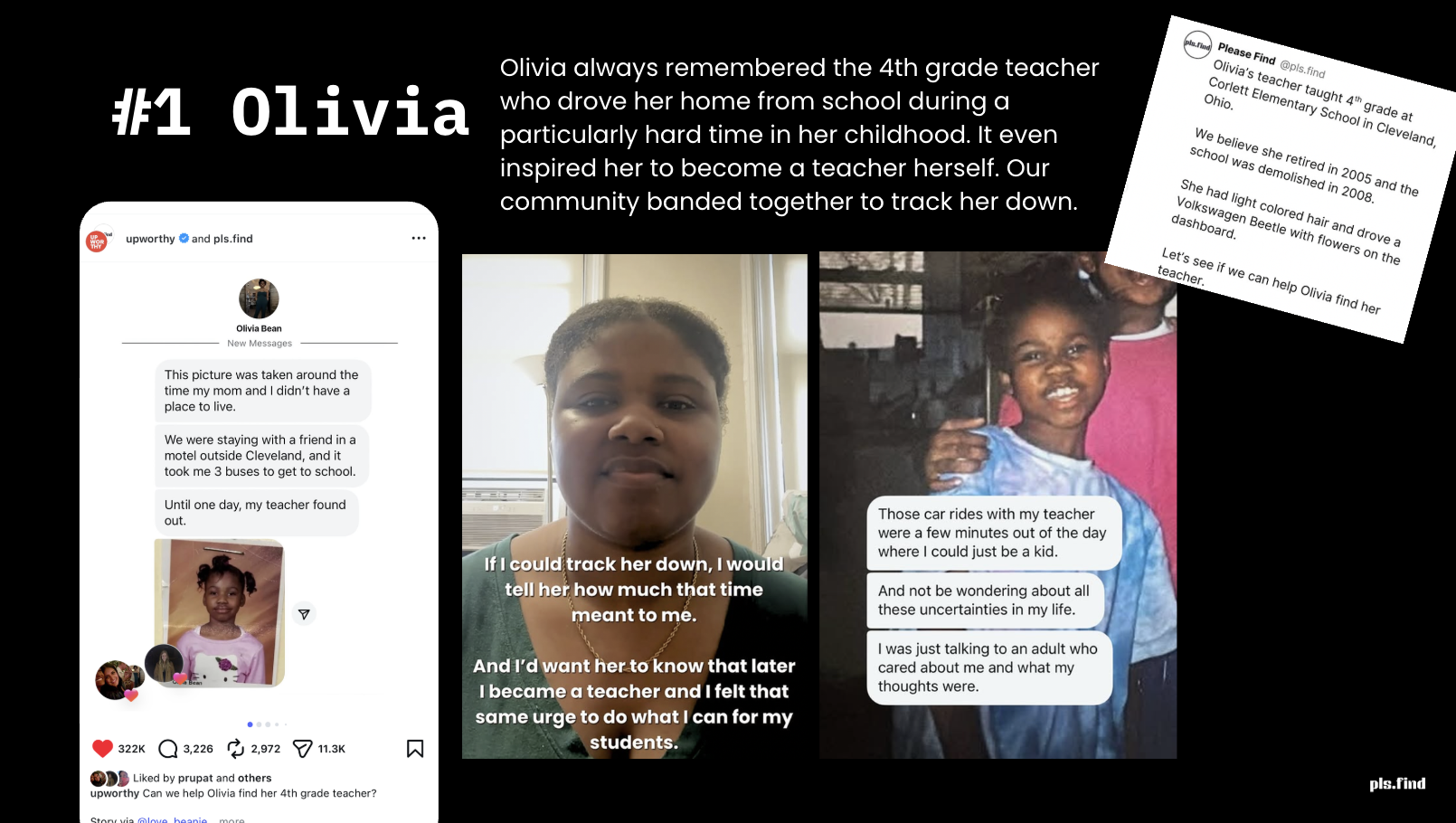The project was conceptualized by Upworthy’s Head of Content & Innovation, Gabriel Reilich, to revive a largely forgotten promise of social media: using technology to connect people in a way that’s rooted in our shared humanity. Through the collective effort of its followers, multiple stories featured on @pls.find have reached deeply moving resolutions.