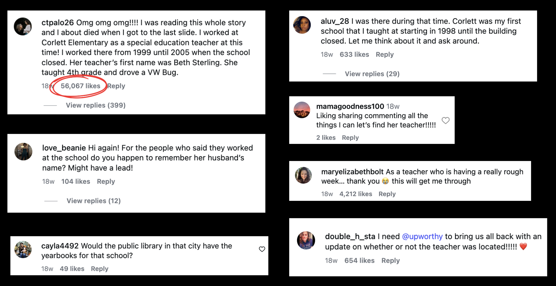 We seeded the project through Upworthy’s existing reach, asking our audience of five million people one simple question: “Is there someone from your past you wish you could get in contact with again, but have no idea how?” From this single post, we received hundreds of responses. Followers shared some deeply personal stories of gratitude, unfinished connections, and moments that significantly impact lives, but ones they never found closure around.