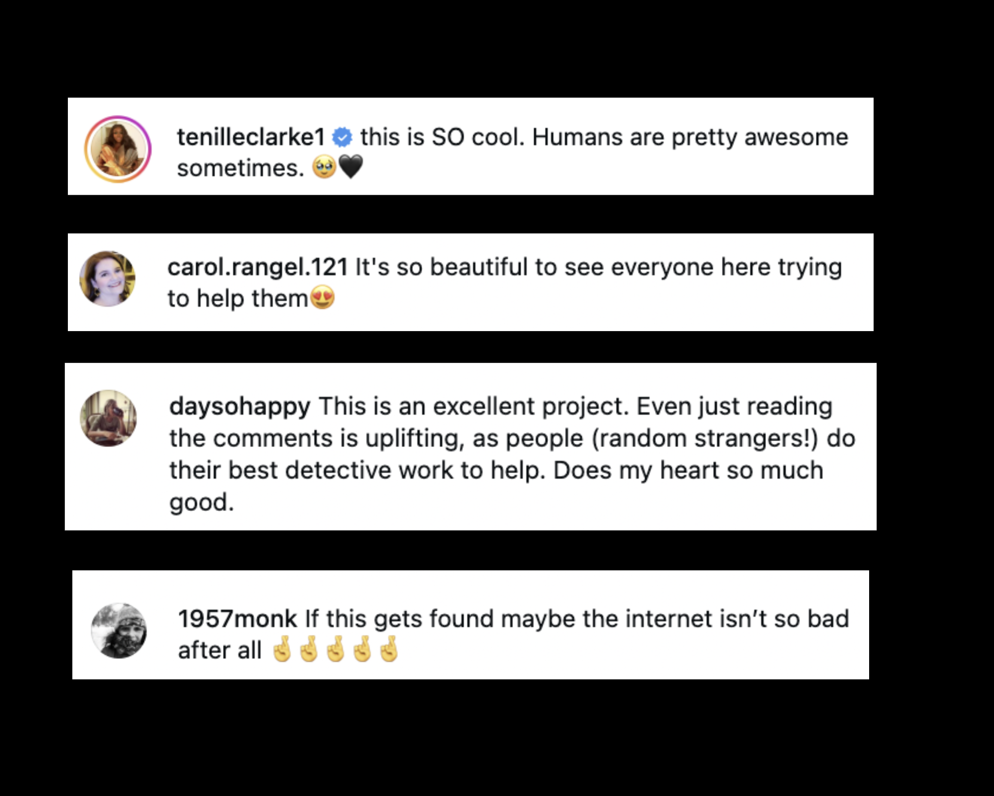 In several other viral moments, @pls.find has tapped into the internet’s instinct to sleuth. But we’re channeling what can sometimes be a problematic impulse into something remarkably special: collective action leading to generous, uniquely human outcomes.