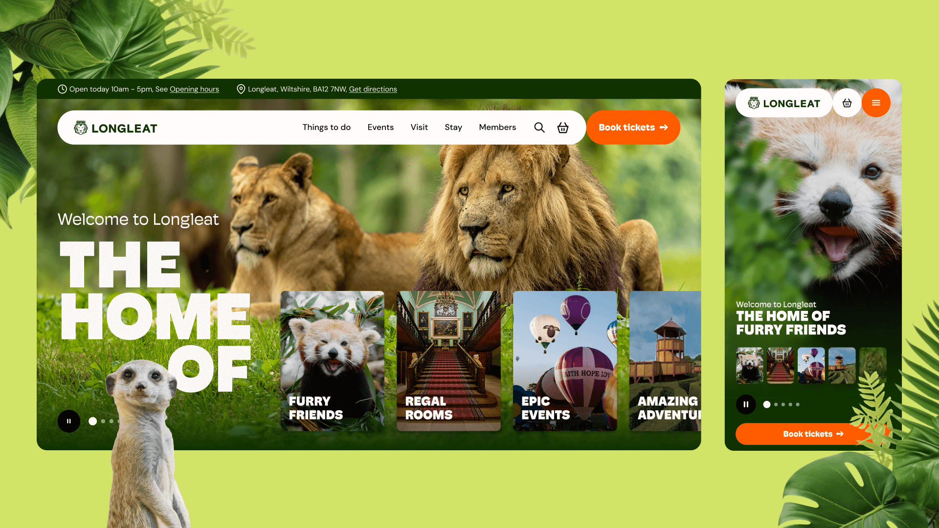 Scroll down and you’ll meet animated avatars of Longleat’s cheekiest residents - lemurs peeking through rustling foliage, meerkats swinging from branches – playfully greeting users. These charming components aren’t confined to the homepage; they keep drawing visitors in through interactive storytelling. Stop by the lion’s page and you’ll find striking photography, bite-sized facts, and VIP experiences to enjoy.