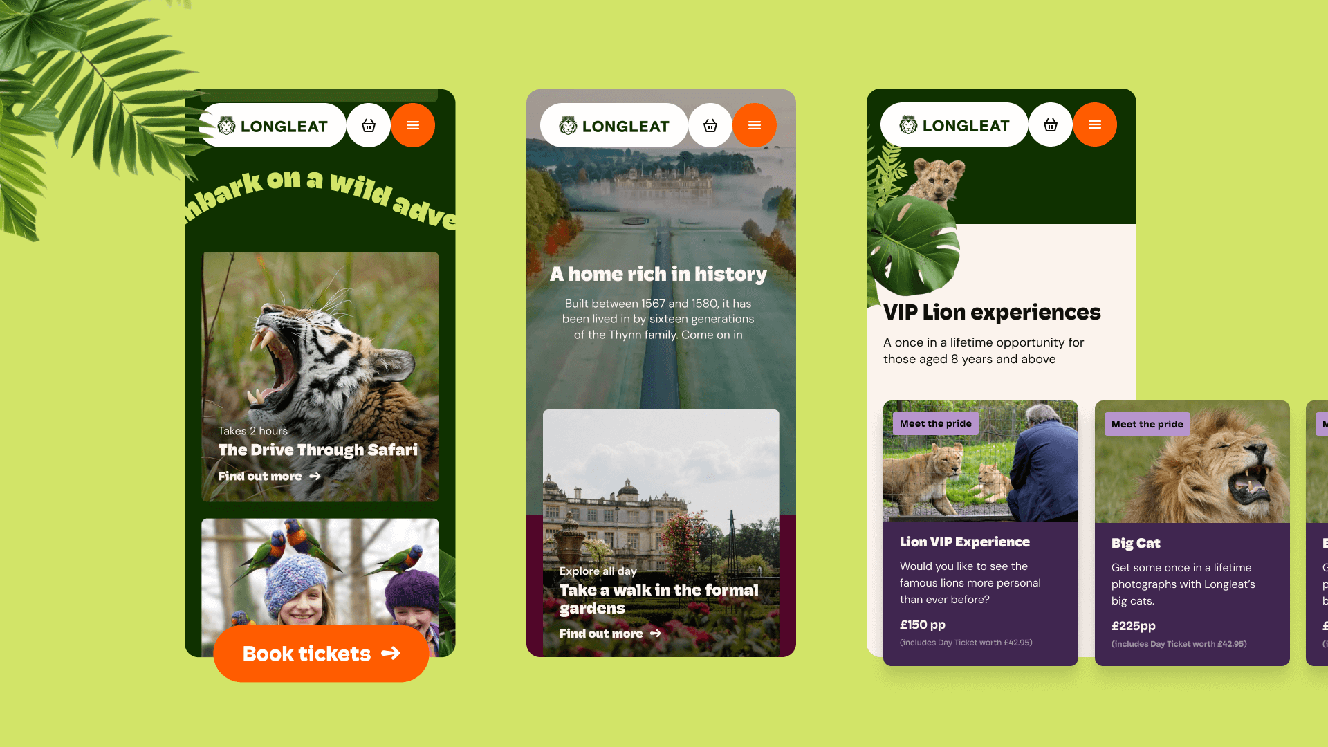 By putting Longleat on a more flexible and stable technical architecture, it was possible to revamp the visual language, amplifying Longleat's identity through a range of mobile-first UI, unlocking its full potential in a bold, digitally native way.