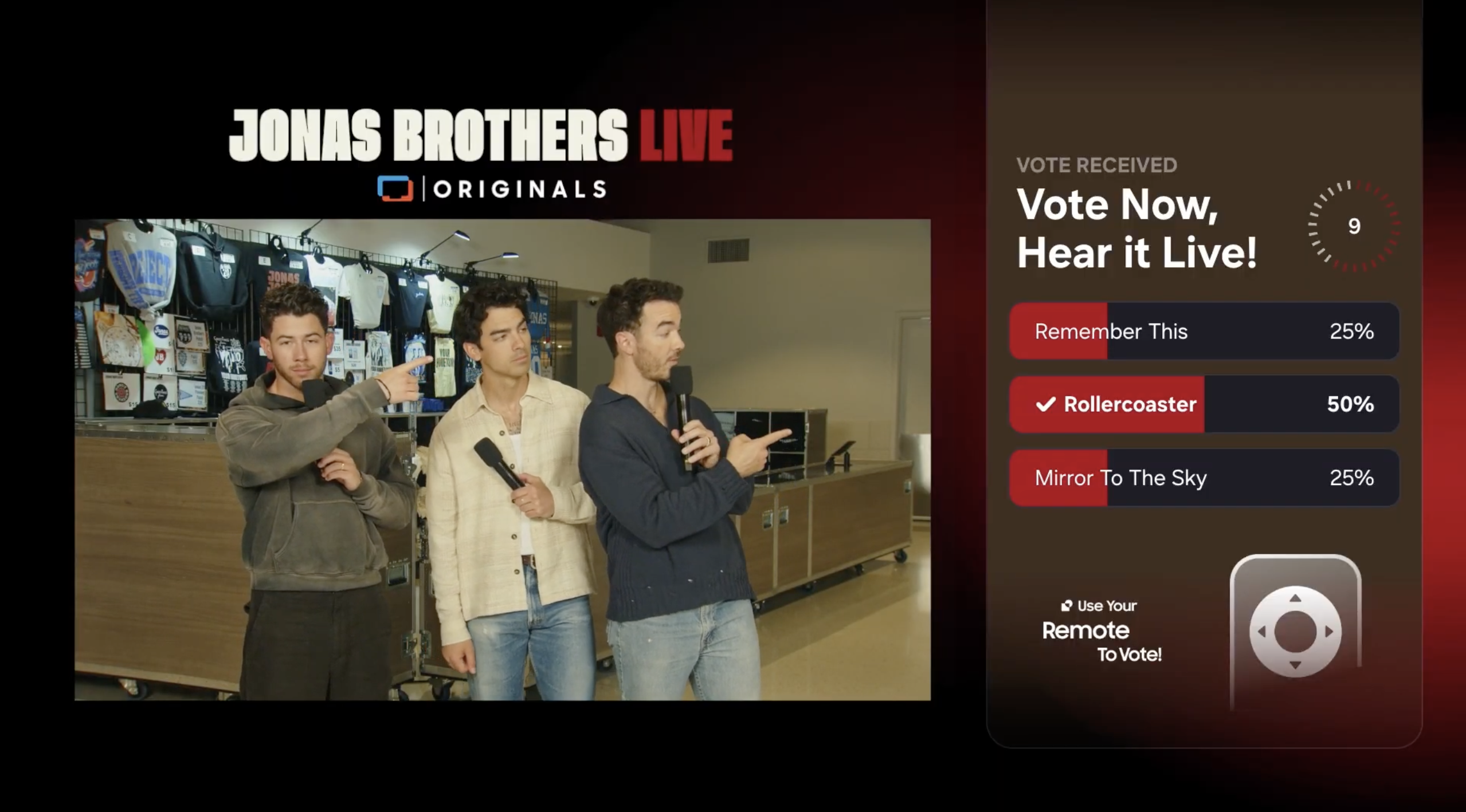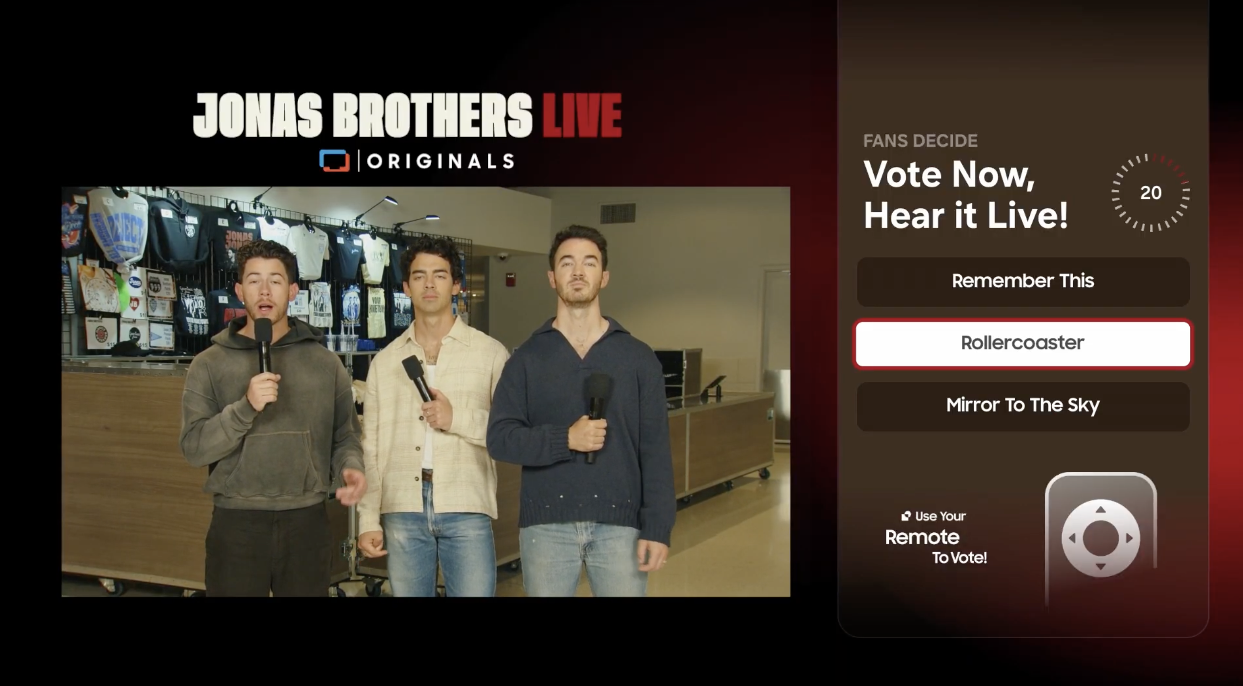 During an exclusive Jonas Brothers concert broadcast on Samsung TV Plus, we set out to give fans something they'd never had before: the power to shape a live performance using just their TV remote. No apps. No logins. No second screens. Just instant voting that would determine which song the Jonas Brothers performed on stage.
