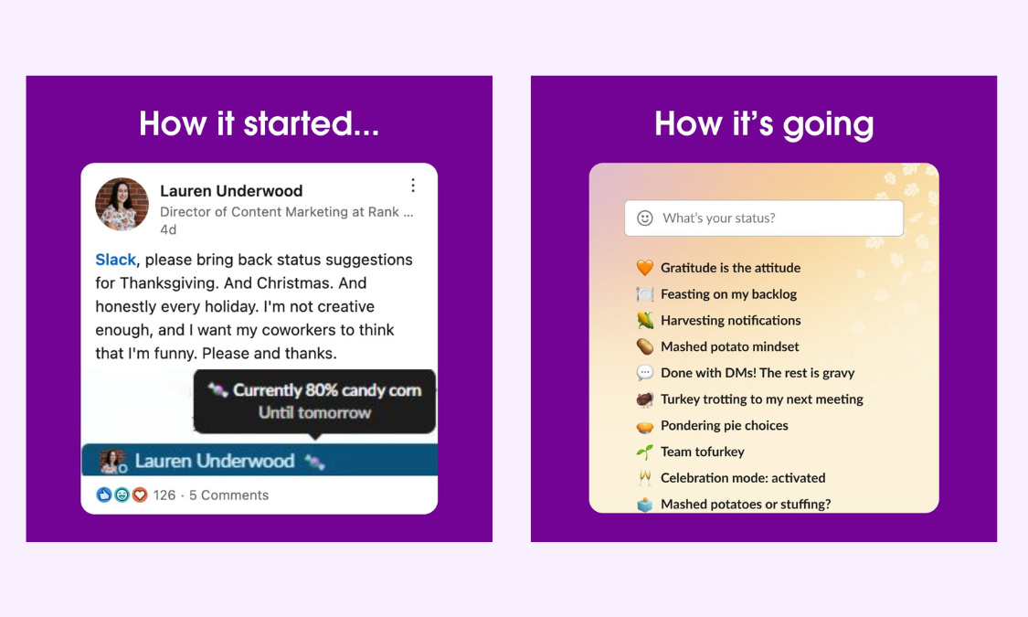 Additionally, this campaign transformed followers into active advocates, with customers voluntarily creating content asking for expanded seasonal features and sharing their workplace experiences with Slack's seasonal updates. One user posted on LinkedIn, “Slack, please bring back status suggestions for Thanksgiving. And Christmas. And honestly every holiday. I'm not creative enough, and I want my coworkers to think that I'm funny. Please and thanks.”