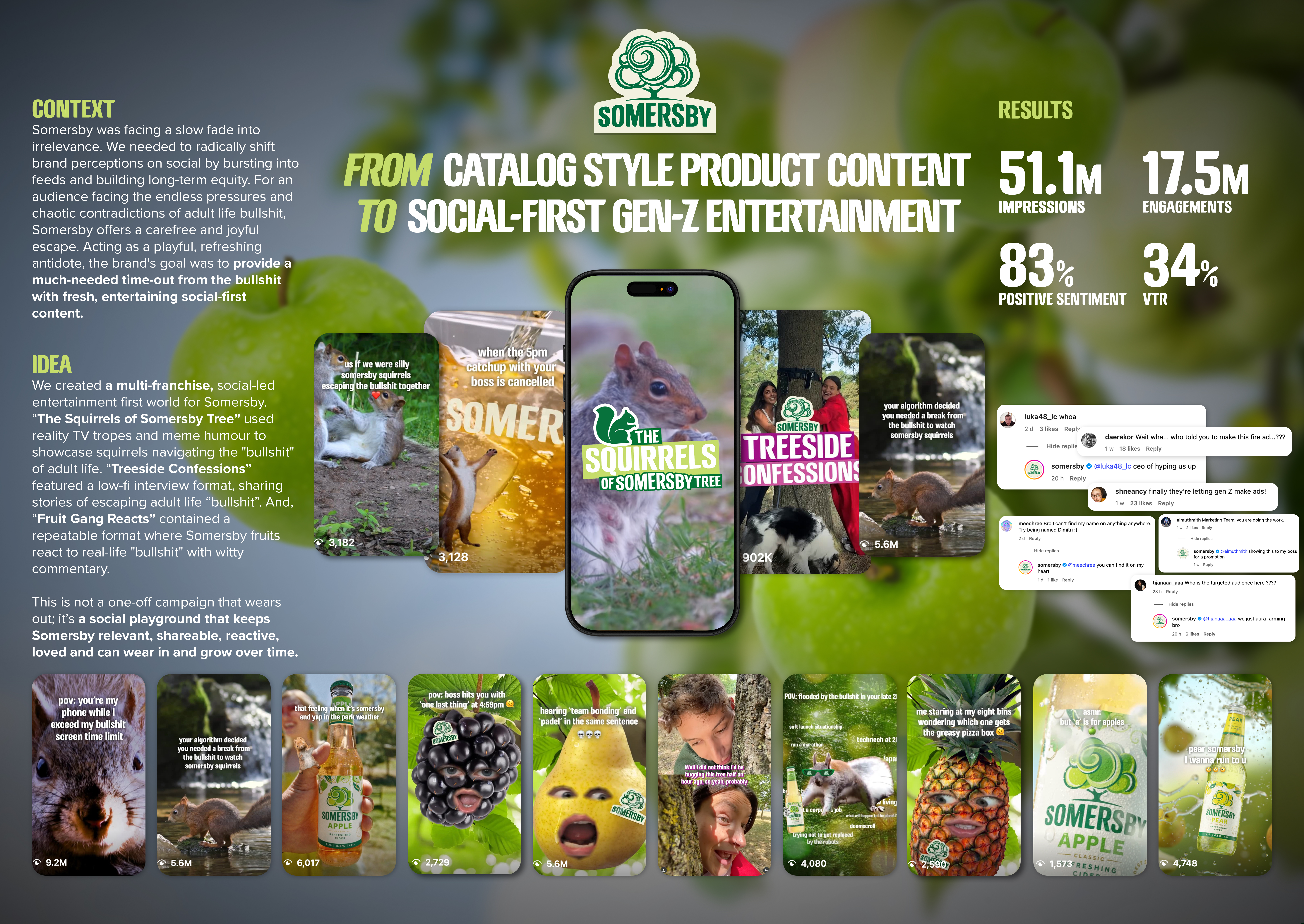 By abandoning endless packshots for playful, scroll-stopping entertainment franchises, Somersby transformed from a forgotten brand into a carefree counter to modern life’s bullshit.