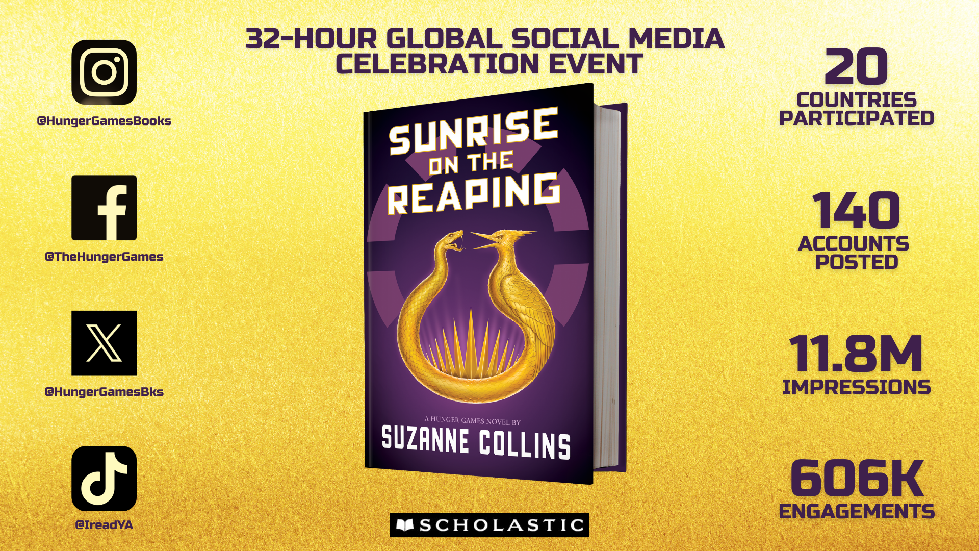 Starting at 12:00 pm ET on March 17, Scholastic’s Official Hunger Games Books social media channels featured immersive fan experiences and exclusive content to generate “Sunrise” excitement throughout the day.