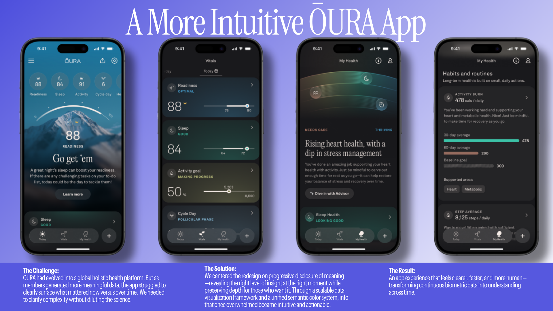 ŌURA members generate over 50 health metrics daily, spanning sleep, readiness, stress, and long-term resilience. As the platform expanded from sleep into holistic health, data volume and complexity grew—but the app experience struggled to surface what mattered now versus over time. Valuable insights were buried beneath increasing density, making it harder to interpret health, build habits, and stay engaged.