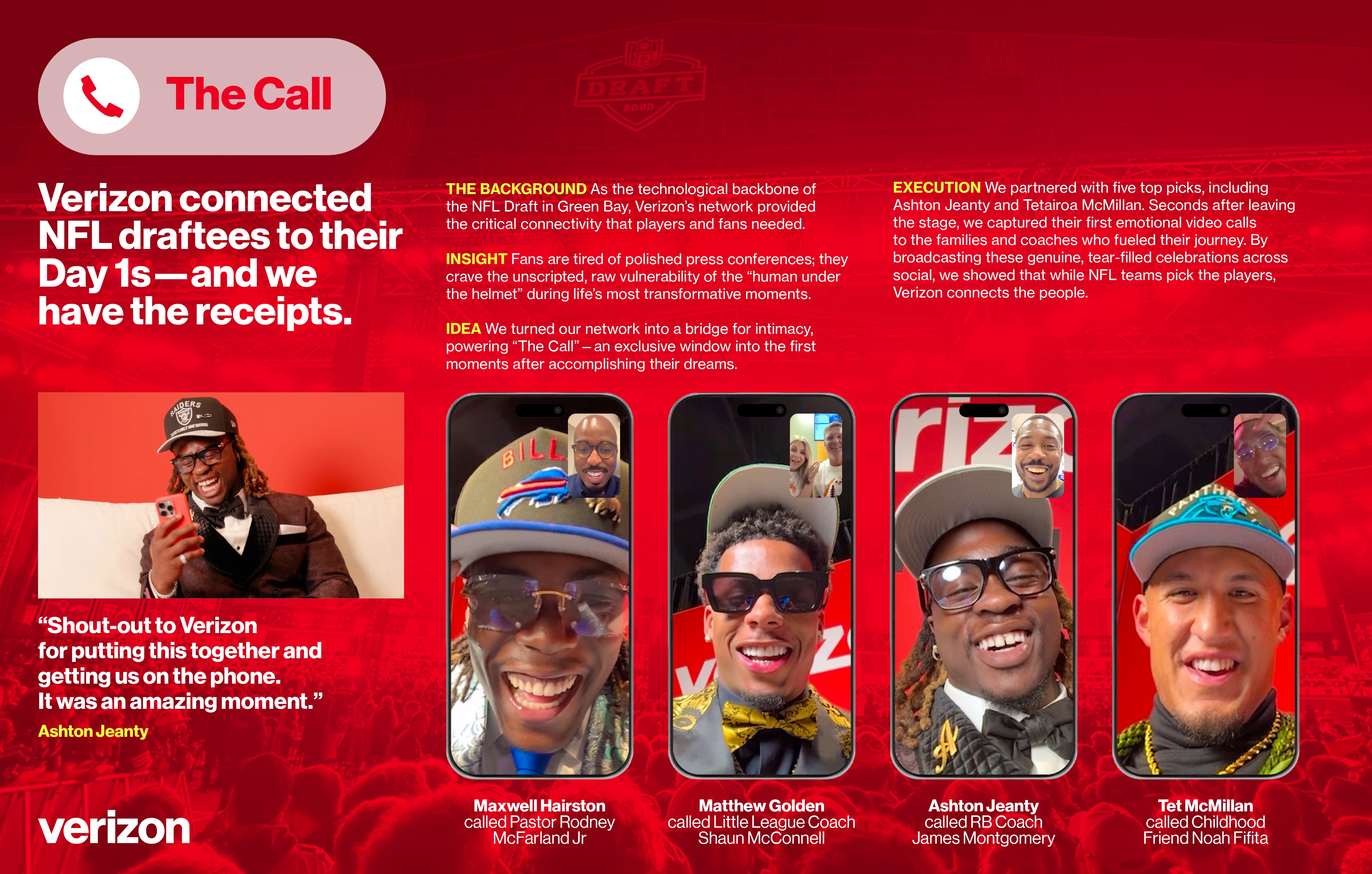 On Draft night, no yards are gained and no touchdowns are scored, yet through "The Call," Verizon proved that our network doesn't just transmit data—it delivers the most important moments in a person's life.