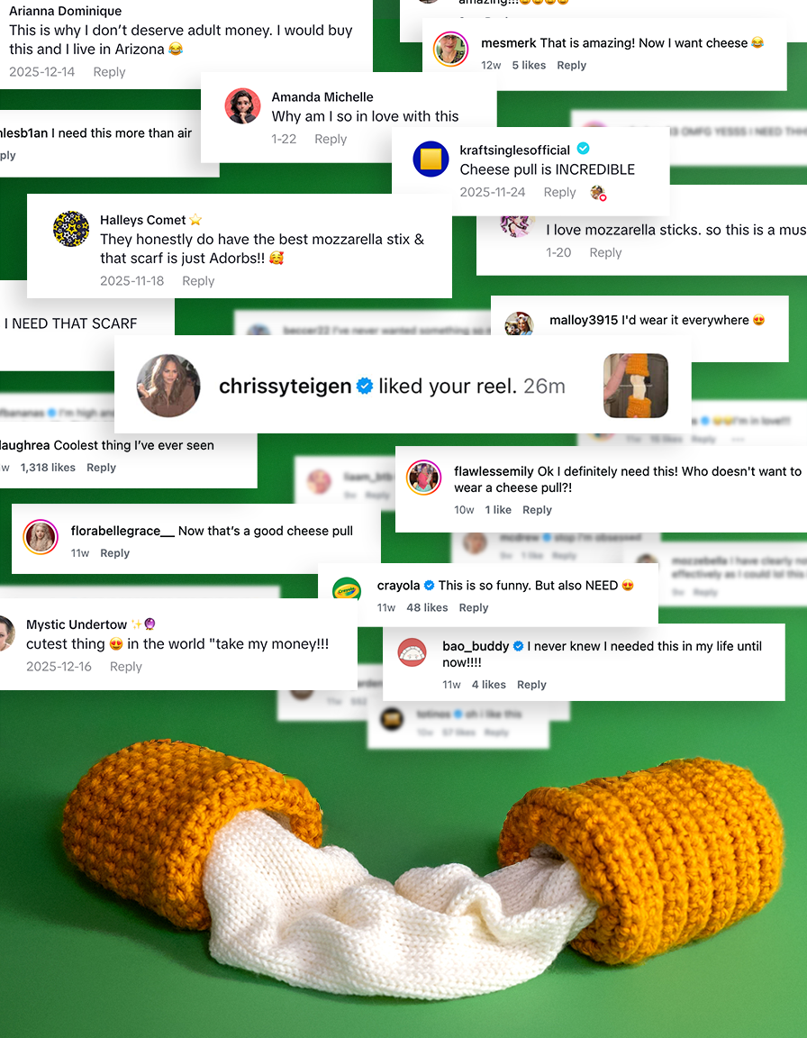 To truly lean into this, we moved away from mass production and instead embraced the ultimate symbol of cozy nostalgia: each scarf was hand-crocheted by a Midwestern grandma. We capitalized on fans' obsession with viral cheese-pull content by transforming a freezer snack into a handmade, "must-have" accessory. This human element made the product naturally "talkable" and gave media outlets a memorable hook that went well beyond a typical product launch.