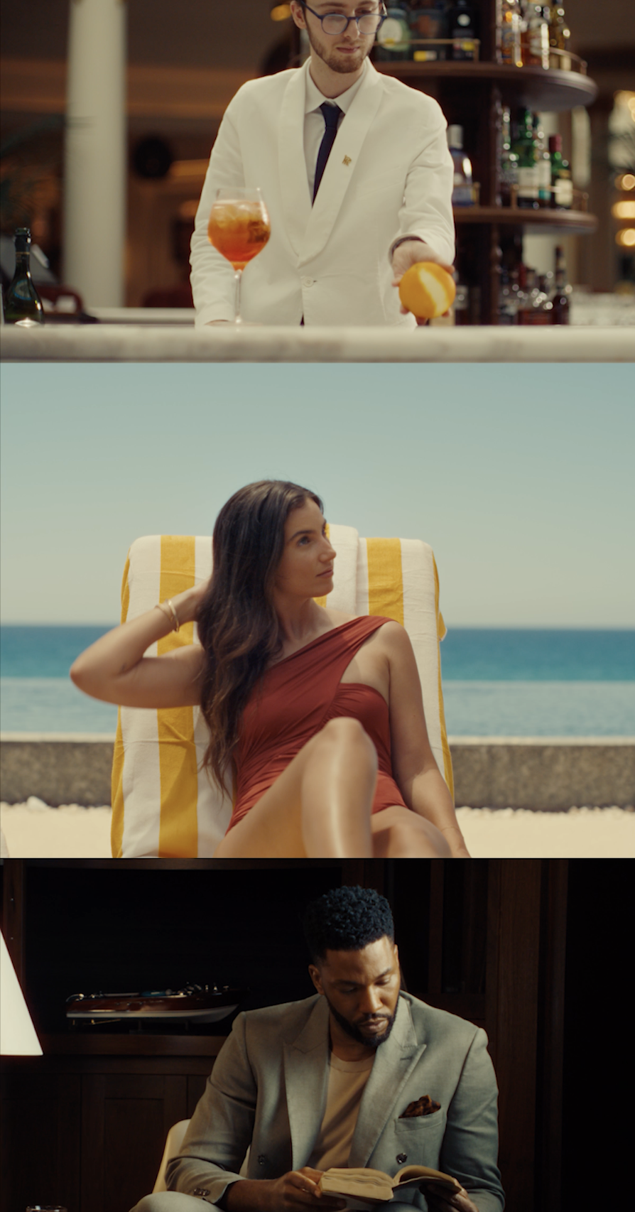 In this vertical triptych, we bring together three hotels, three guests, and one unexpectedly shared moment. At the top, a bartender at The Palace, a Luxury Collection Hotel, Madrid slices an orange at La Cúpula Restaurant. The orange rolls along the marble counter and drops out of frame—falling into the hands of a beachside sunbather lounging at Solaz, a Luxury Collection Resort, Los Cabos. With a graceful peel and a flick of the wrist, she drops a slice of orange into the frame below, where it lands in the glass of a guest reading in the library of Perry Lane Hotel, a Luxury Collection Hotel, Savannah. The video showcases a surreal moment of synchronicity, shared across time zones and temperaments.