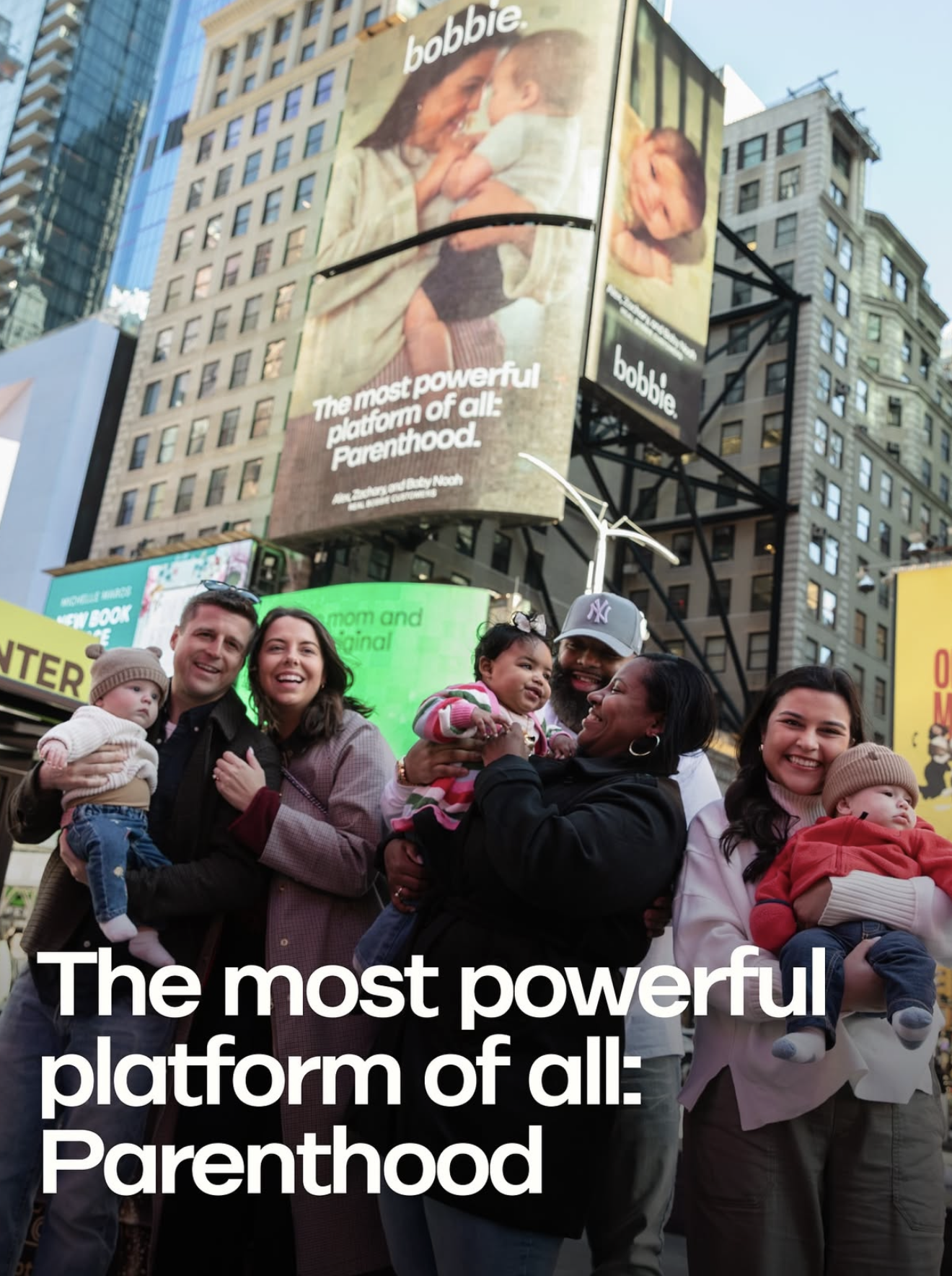 The creative centerpiece was a new Times Square billboard featuring real Bobbie families using their own family-generated photos. By placing these unfiltered moments in one of the most iconic advertising spaces in the world, Bobbie reframed everyday parenthood as cultural influence.
