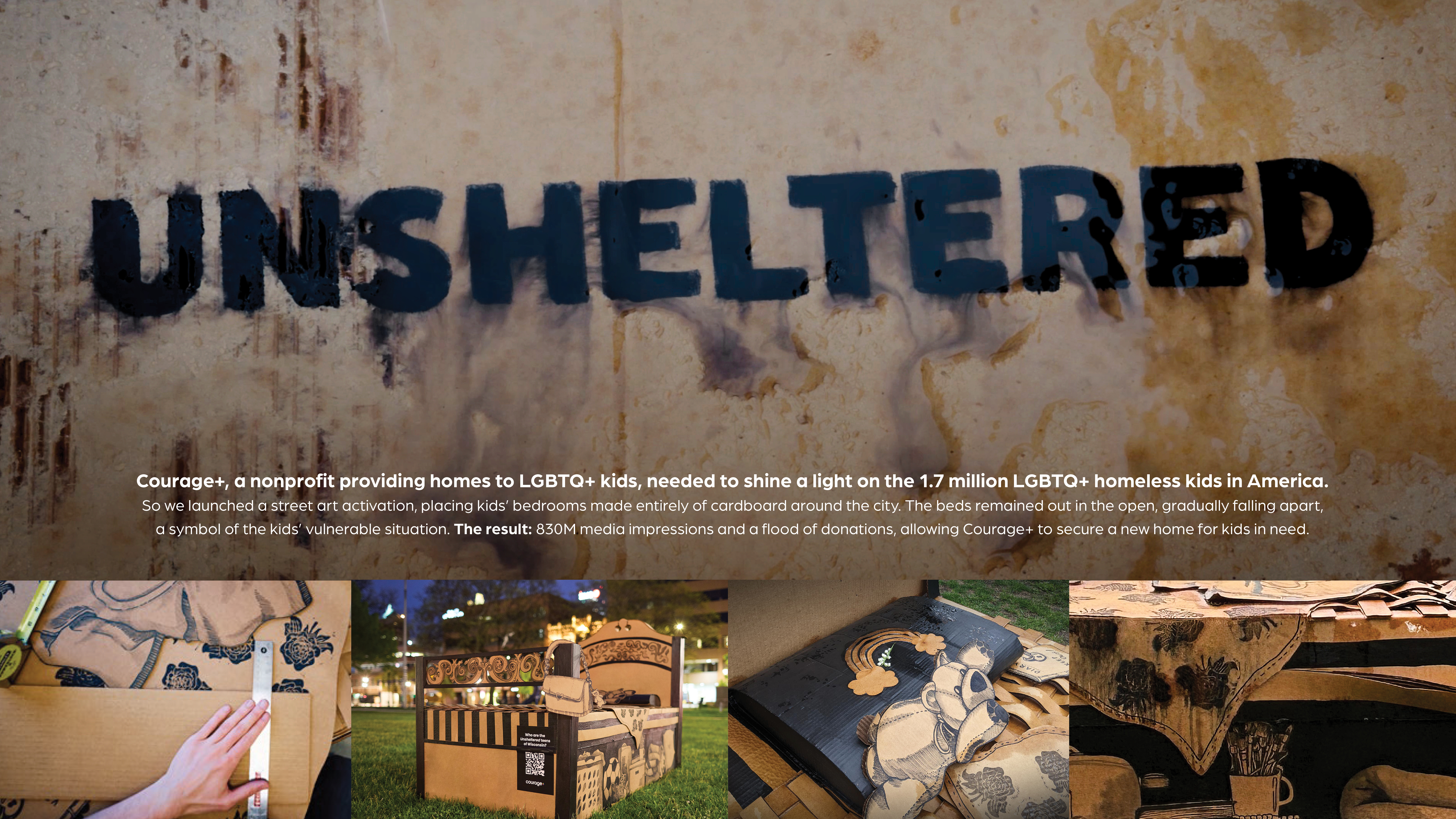 RESULTS: Unsheltered generated more than 830 million earned media impressions. Donations tallied over $30,000 in the first two weeks alone. In total, the Unsheltered story and coverage helped raise enough funds for Courage+ to purchase an entirely new house. We took an abstract issue and made it a shared public experience, inspiring support and transforming cardboard into real bedrooms and real safety.