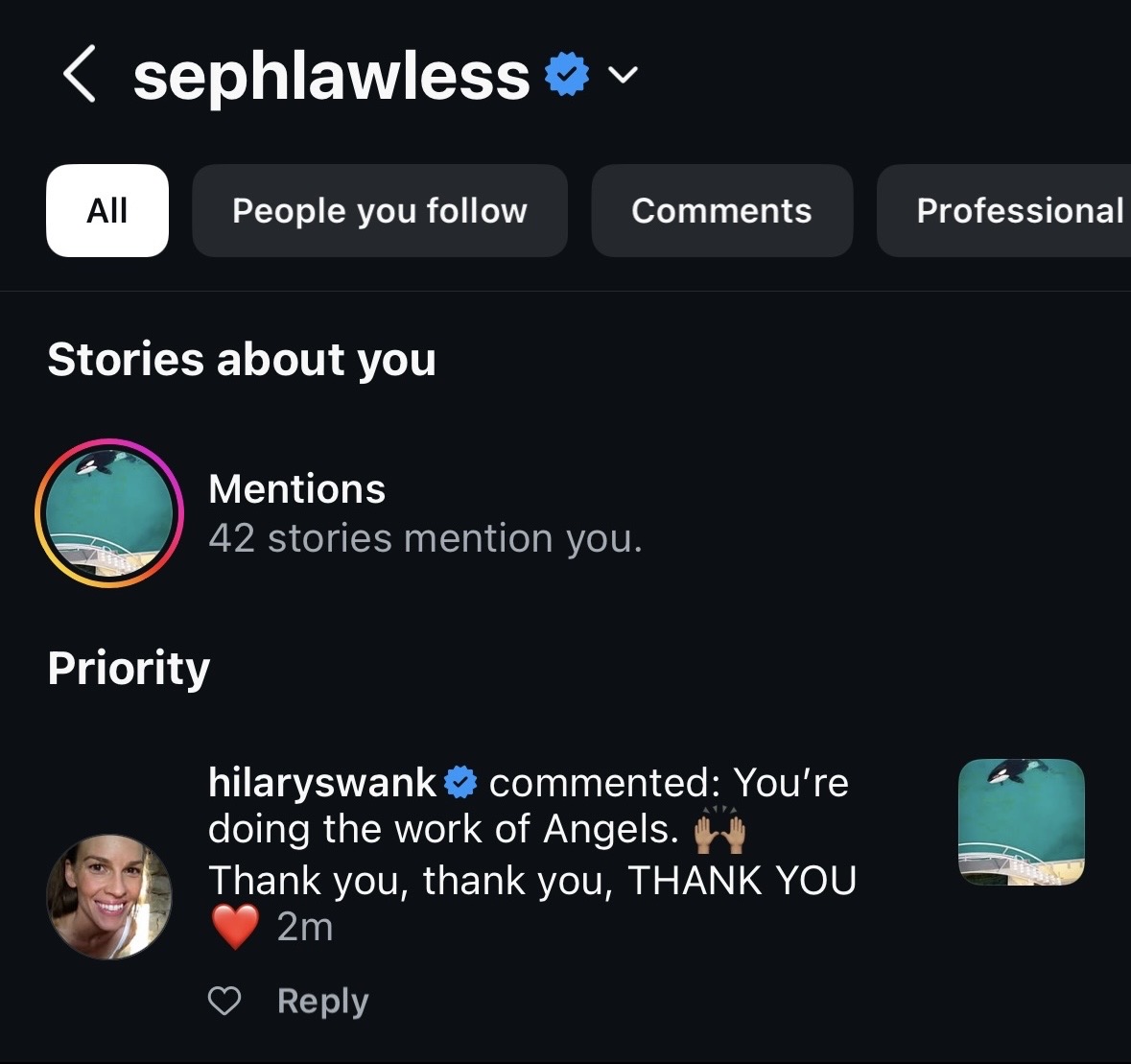 High-profile public figures directly engaged with and amplified the work. Academy Award winners Hilary Swank and Joaquin Phoenix, along with global cultural figure Bella Hadid, publicly liked, commented on, and shared the content to their Instagram Stories while tagging the creator. Their engagement extended the reach to millions of additional viewers and accelerated public awareness at a global scale.