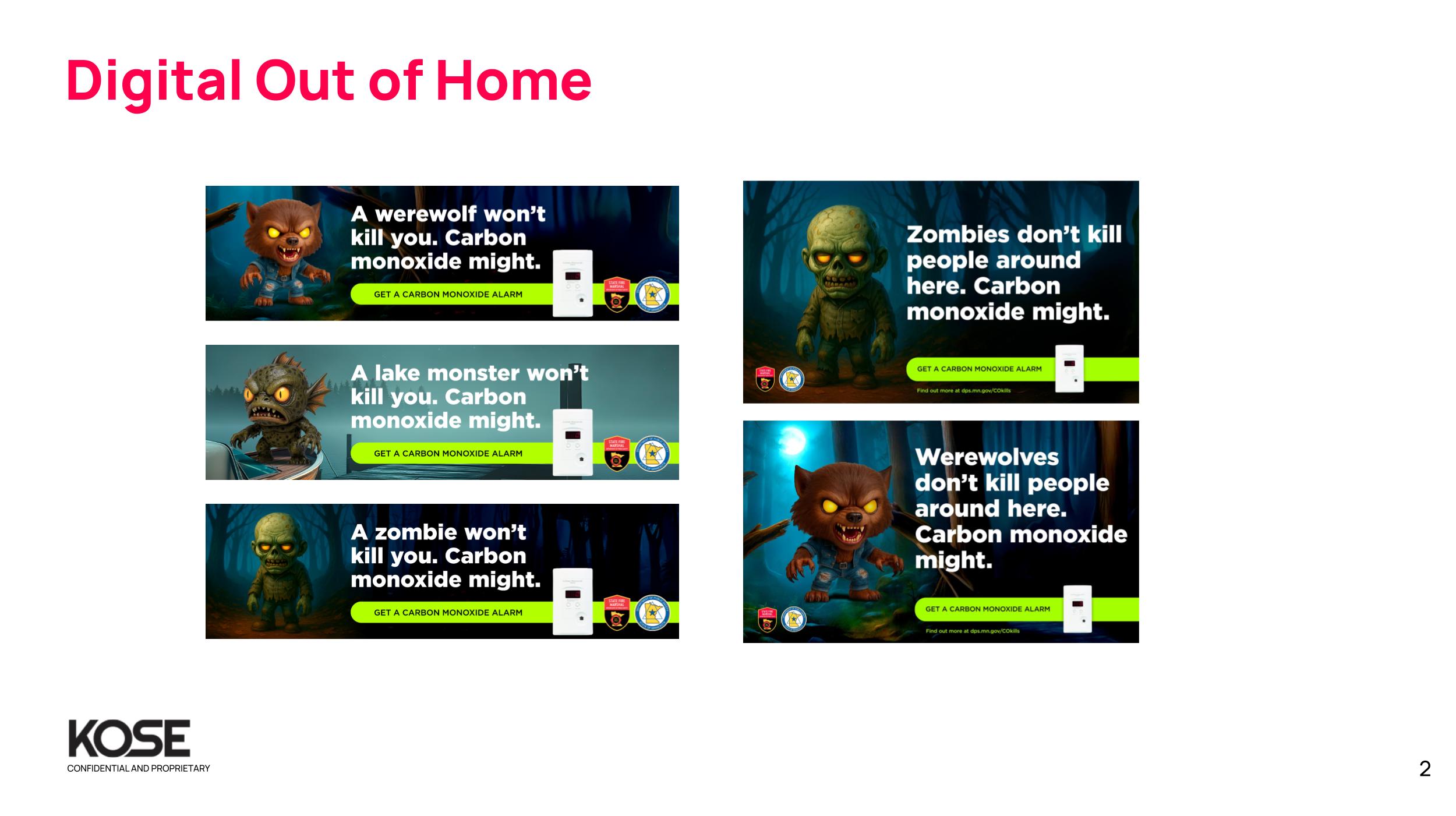 Carbon monoxide is a silent killer—odorless, colorless, and often overlooked. To capture attention and save lives, the Minnesota Department of Public Safety (MDPS) and the State Fire Marshal partnered with independent media agency KOSE and independent creative agency Electric, to launch a suspense-themed public awareness campaign using classic horror tropes and artificial intelligence to expose a real danger hiding in plain sight.
