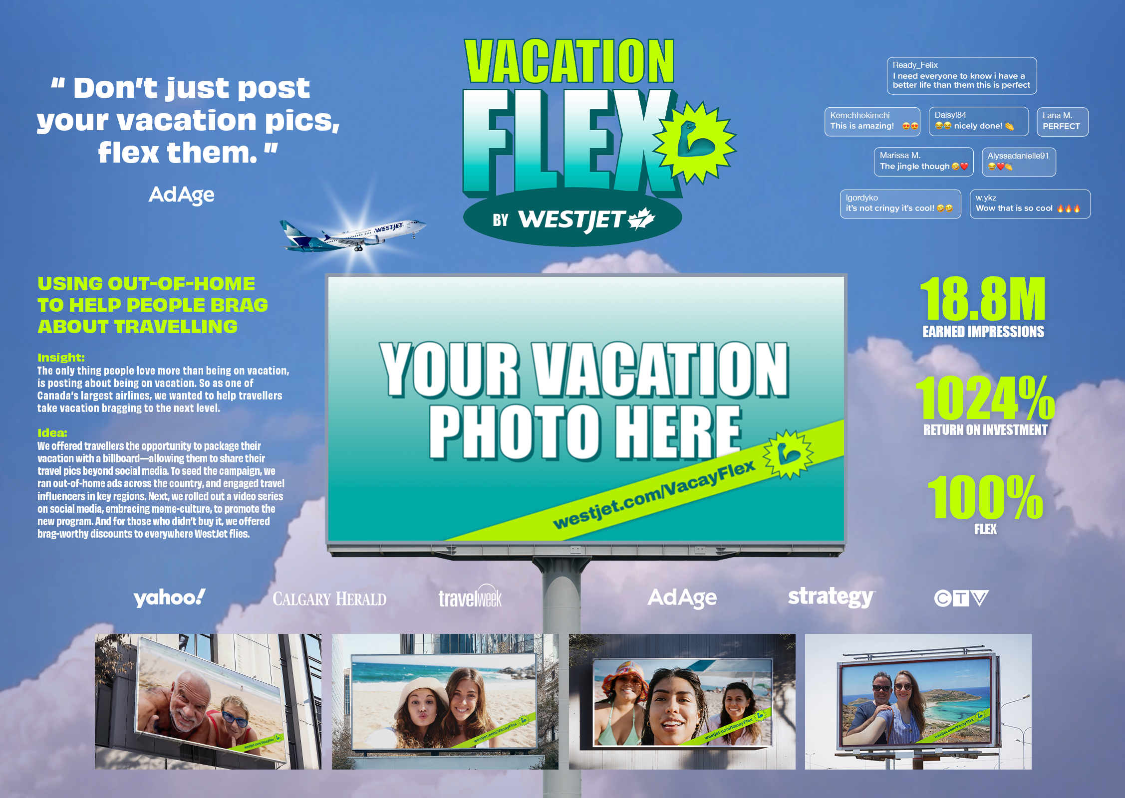 So we launched “Vacation Flex,” giving travellers the chance to post their vacation pics on billboards when they booked a trip with WestJet. To seed the campaign, we ran out-of-home ads across the country, and engaged travel influencers in key regions. Next, we rolled out a video series on social media, embracing meme-culture, to promote the new program. And while only so many billboards were up for grabs, we gave everyone that visited our landing page flight deals worth bragging about.