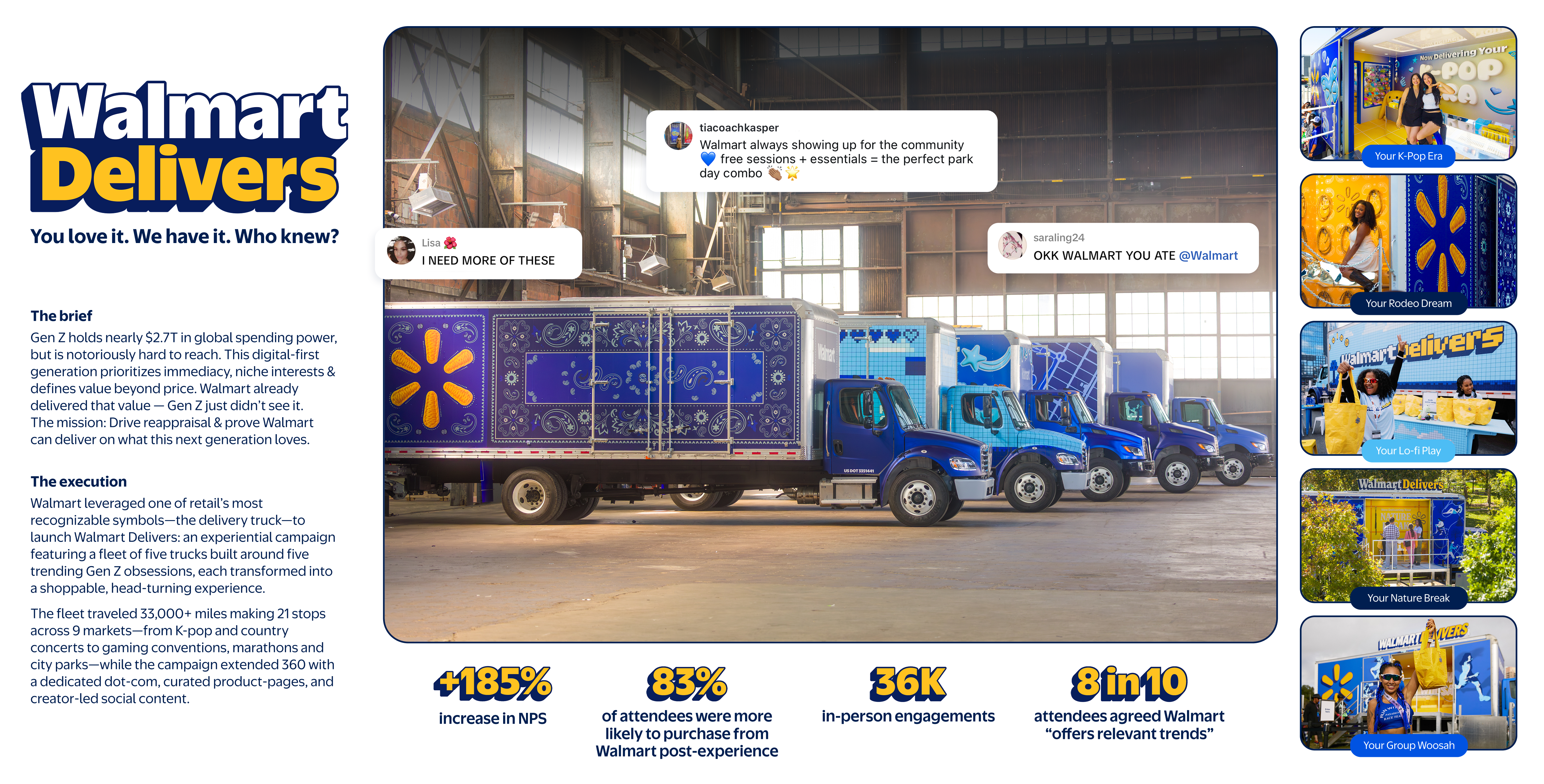 Leveraging one of retail’s most recognizable symbols, the delivery truck, Walmart delivered an experiential campaign that met Gen Z where they are, while challenging what people think they know about the brand. While others chased macro trends, Walmart tapped into Gen Z’s micro-cultures, delivering on their unique needs and wants, no matter how specific.