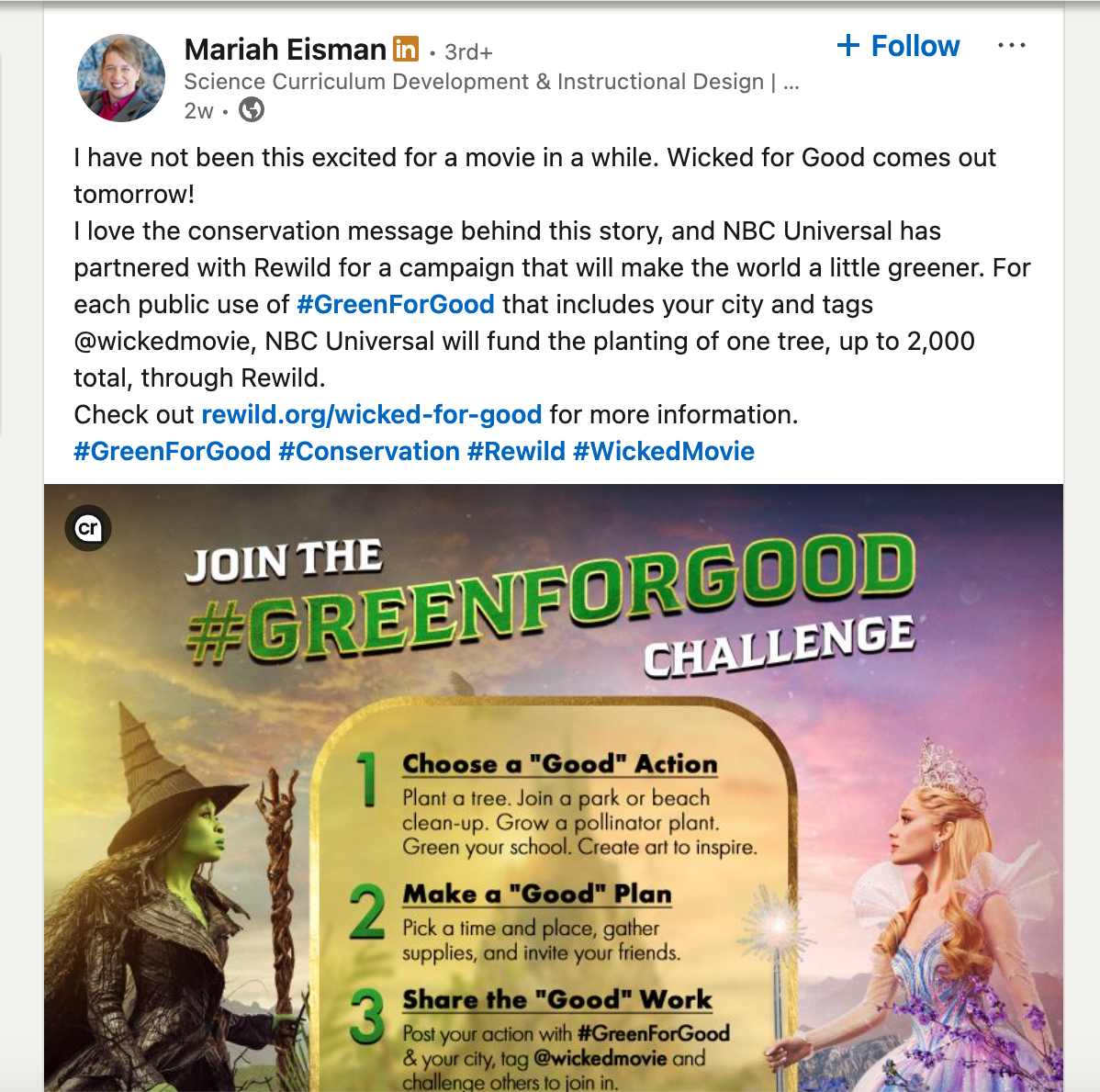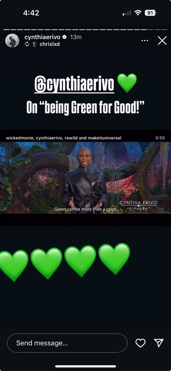 The use of talent-led videos and influencer collaborations generated strong engagement and positive recognition. NBC.com wrote that “...Erivo and her fellow WICKED family members…are proudly standing up for the environment with the Green for Good campaign.” A former LA Times columnist commented, “For a major studio, this is a good approach to sustainability storytelling: use your biggest stars and loudest megaphones, then offer clear pathways for audiences who want to go deeper.”