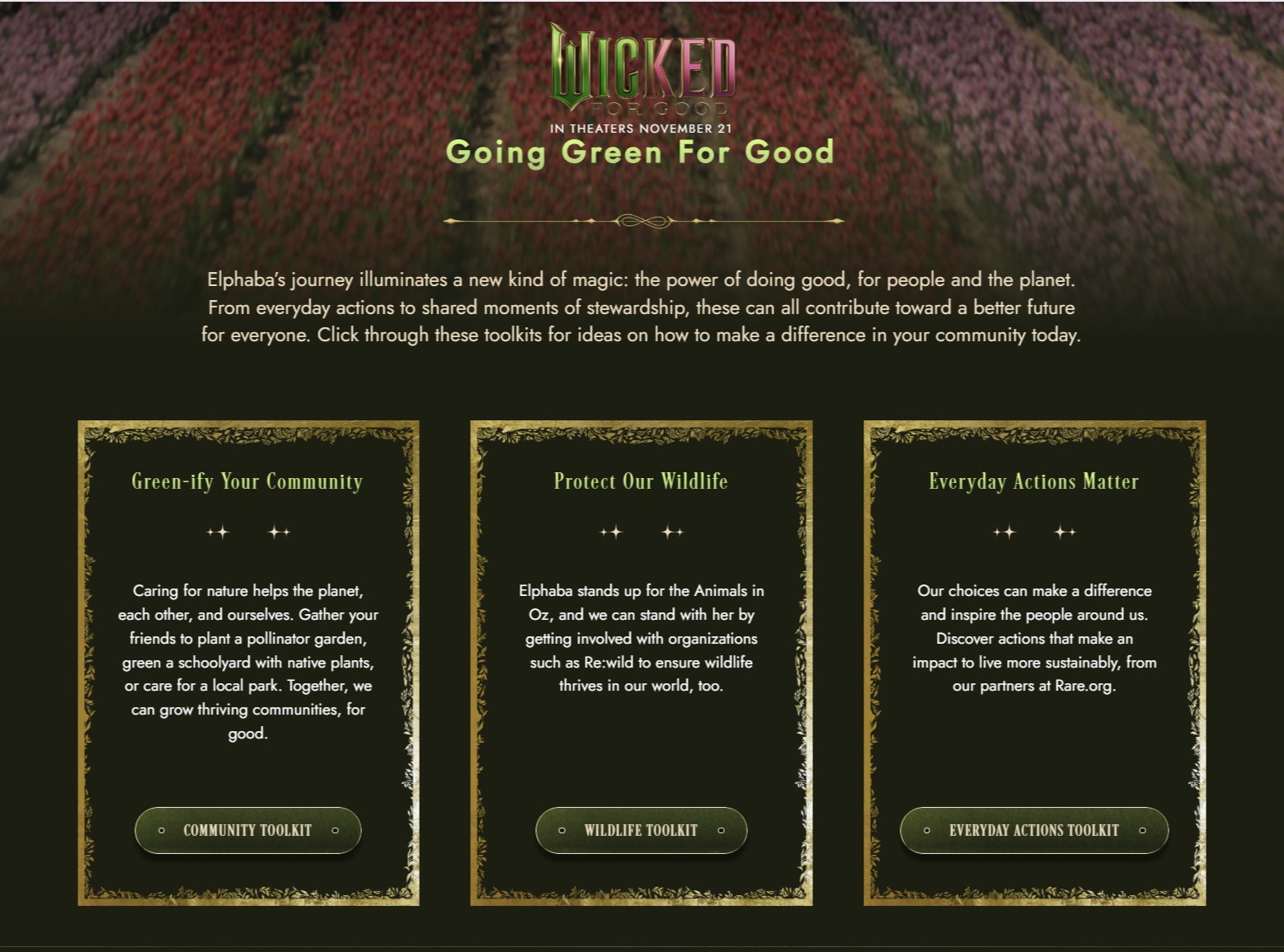 The core idea for the “Green for Good” campaign originated with the themes that already exist within the story. At the heart of WICKED: FOR GOOD is Elphaba, an iconic character whose commitment to challenging unjust systems had already proven to resonate with audiences – for decades in the smash hit Broadway musical, and then in 2024’s record-breaking WICKED. A global theatrical release with a passionate, multigenerational fanbase, this film presented a unique opportunity to connect popular culture with tangible sustainability efforts.