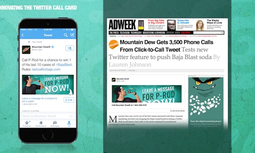 "Last Call for Baja" leveraged Twitter's call card and one of DEW's most popular athletes, pro skateboarder Paul Rodriguez (P-Rod), to close the LTO with a huge bang. Towards the end of the summer, Mountain Dew leveraged the brand new Twitter Call Card, a click-to-call feature intended for customer service. We reimagined it, using it in a way no one had yet thought of. Clicking on said button automatically called a phone number with a voice recording by P-Rod. To enter to win one of 10 remaining cases of Mountain Dew Baja Blast users left a voice message telling P-Rod why they deserved one of the last beverage cases.